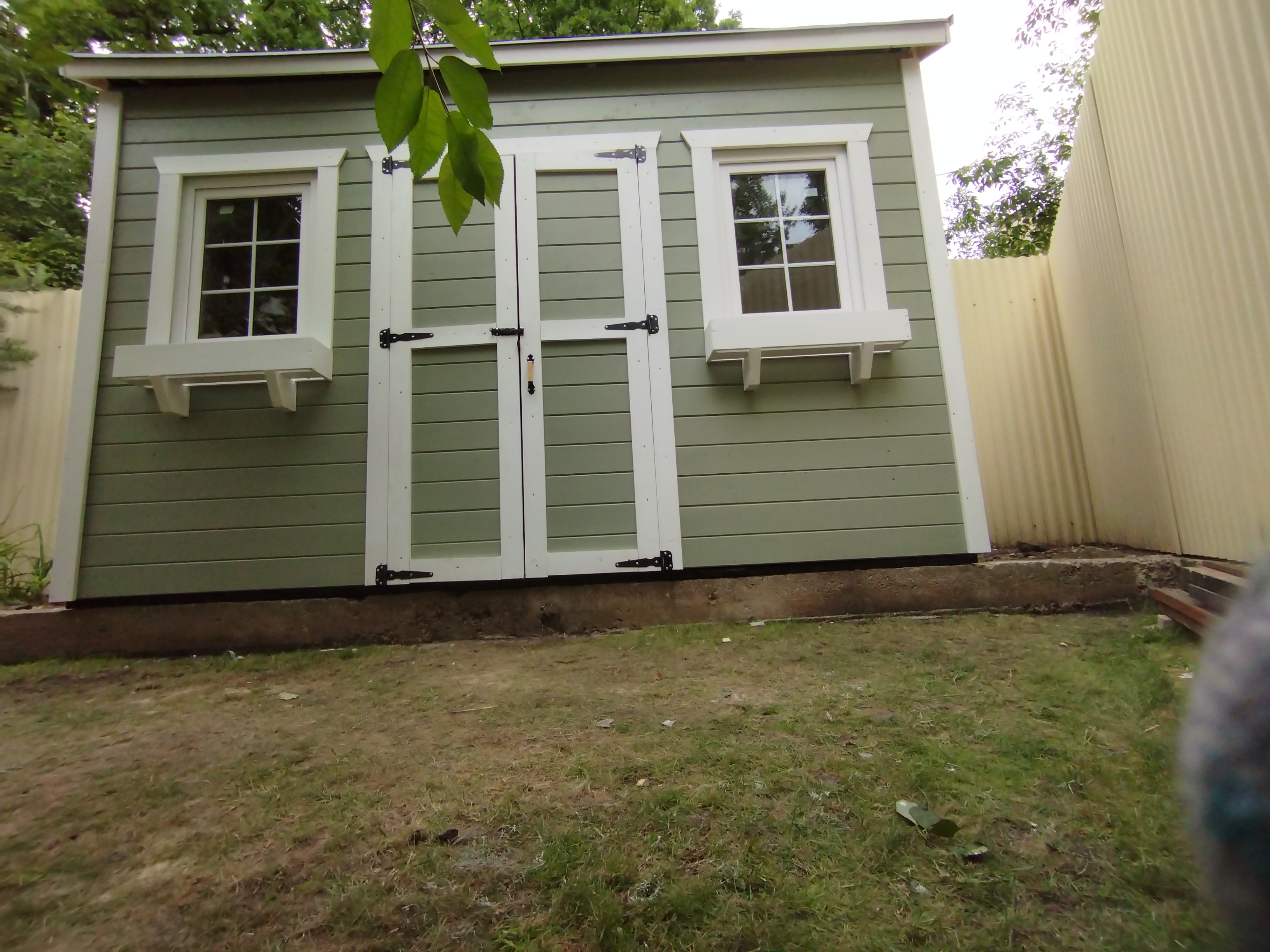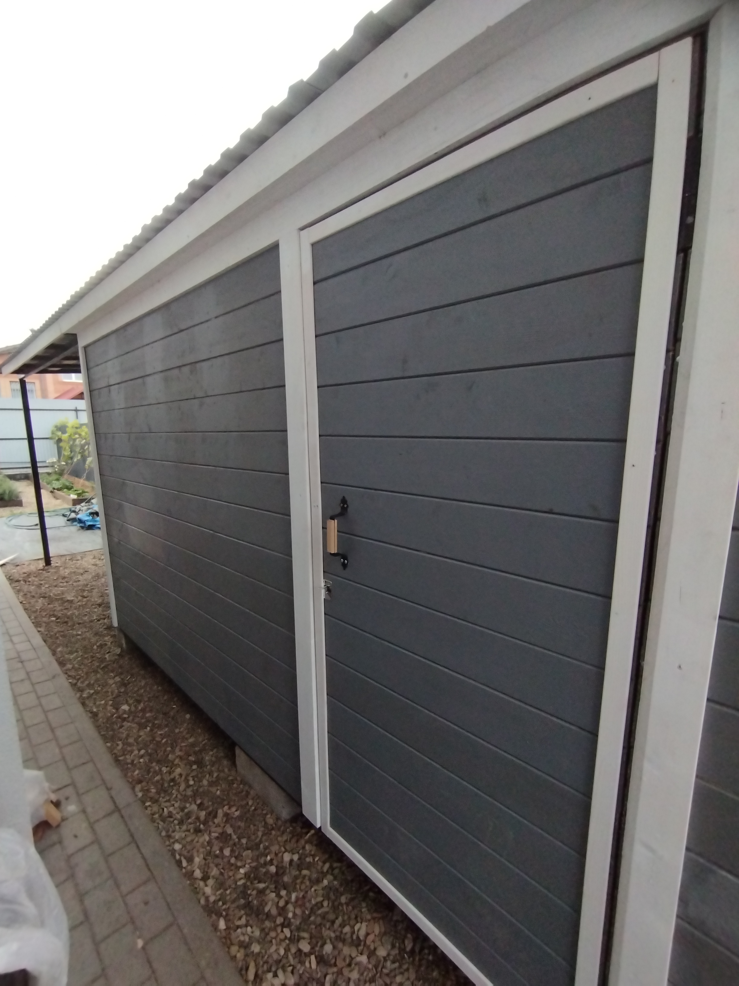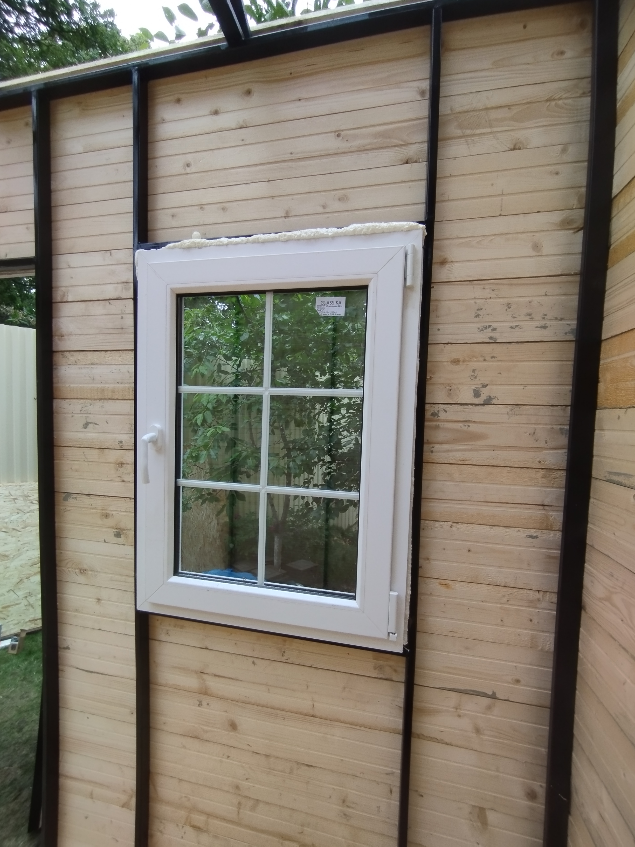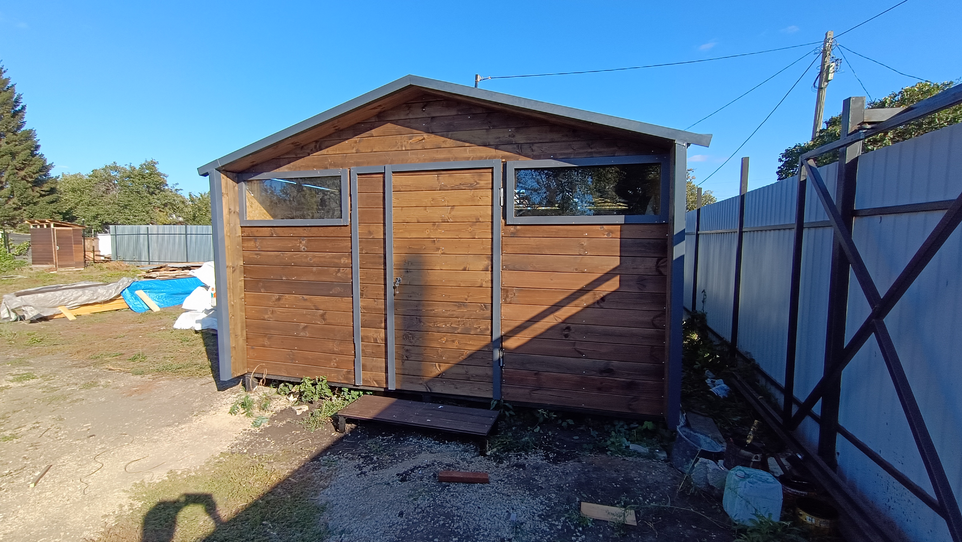 Фасад — вагонка сорт АВ (покраска антисептиком в цвет на выбор) + профнастил сс-10 Кровля – кровельный профлист Р-20 или металлочерепица (возможна мягкая кровля за отдельную плату) Полы – доска 40х150 мм Окно — Пластиковое окно 650х750 мм однокамерное, белый профиль. Врезной замок. |